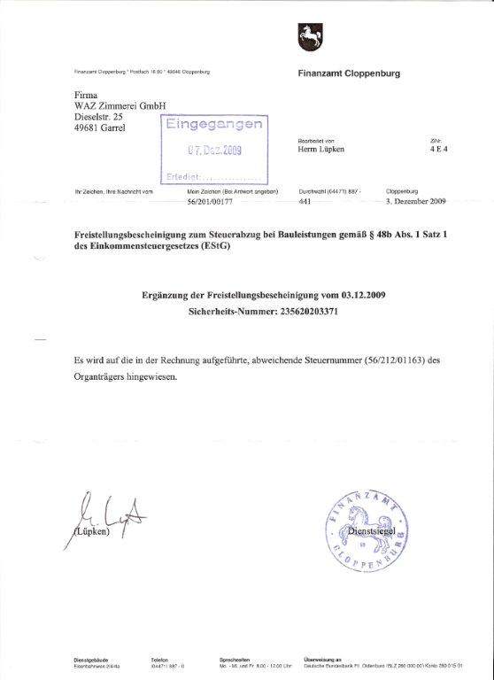 >> Freistellungsbescheinigung 2010 - 2012 >> Ergänzung zur Freistellungsbescheinigung